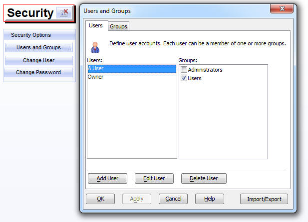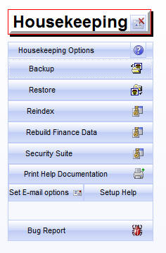 Security options under your control. Backup or restore your data, Rebuild indexes, Rebuild all your finance data - in case you have made any mistakes, Add or chnage users and passwords, Print a hard copy of the comprehensive Help Text, Send a bug report or ask for assistance. |